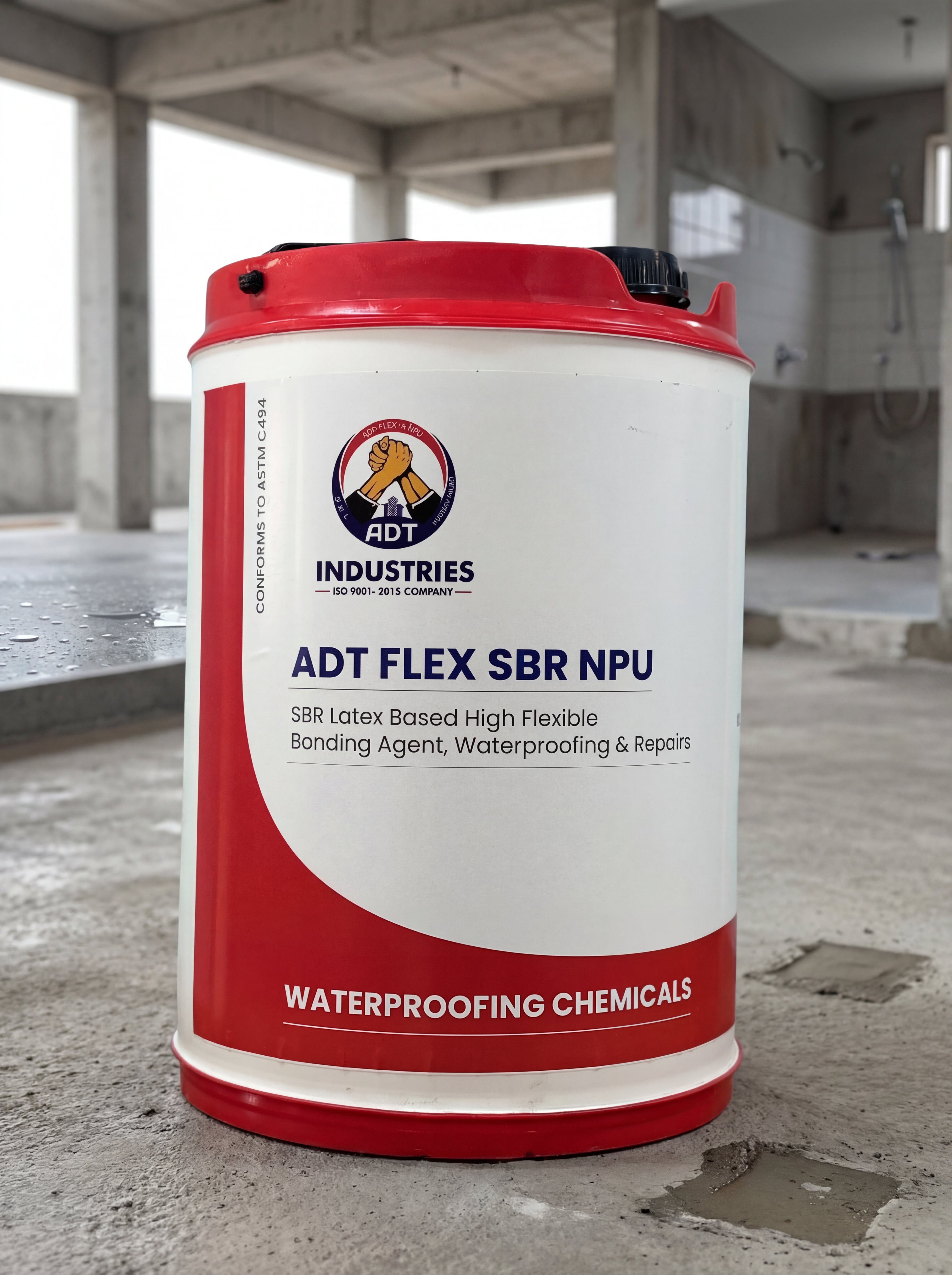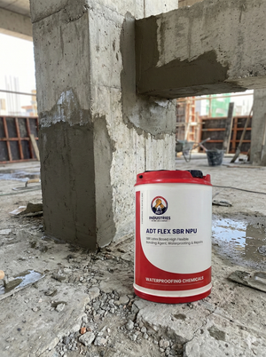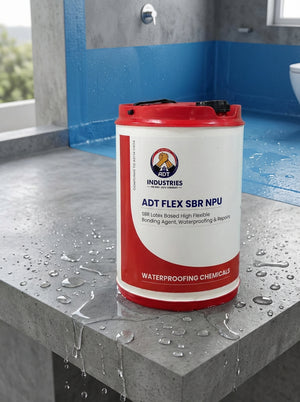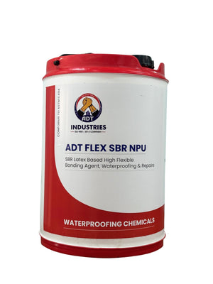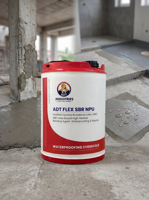 ADT FLEX SBR NPU is based on modified Styrene butadiene latex used for high performance applications in waterproofing and repairs. It is used for repairs of spalled concrete such as –floors, columns, beams, chhajjas, slabs & waterproofing of toilets & bathrooms & terraces. It bonds strongly to old & new concrete & plaster.