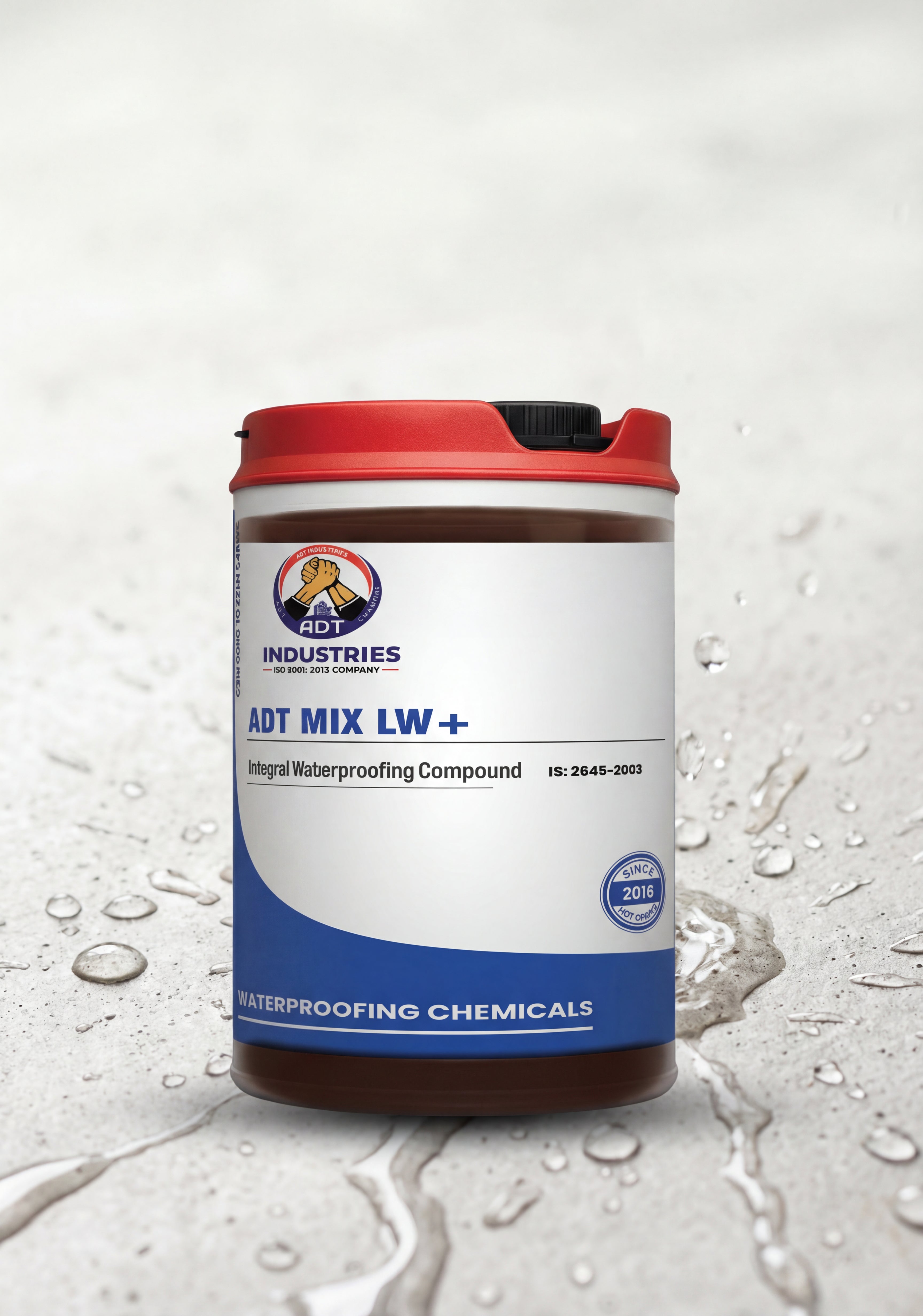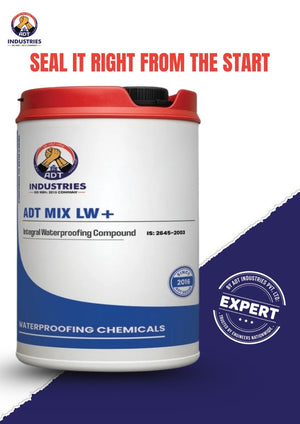 ADT MIX LW+ is a dark brown liquid designed specifically to allow superior workability in concrete / mortar / plaster mixes with reduced water and also achieve high resistance to water ingress. ADT MIX LW+ waterproofs by improving the quality of the concrete or mortar or plaster. It reduces the water demand for required workability and minimizes segregation and bleeding. Thus, it is more efficient compared to traditional powder water proofers as its use results in two-fold improvement of concrete or mortar.