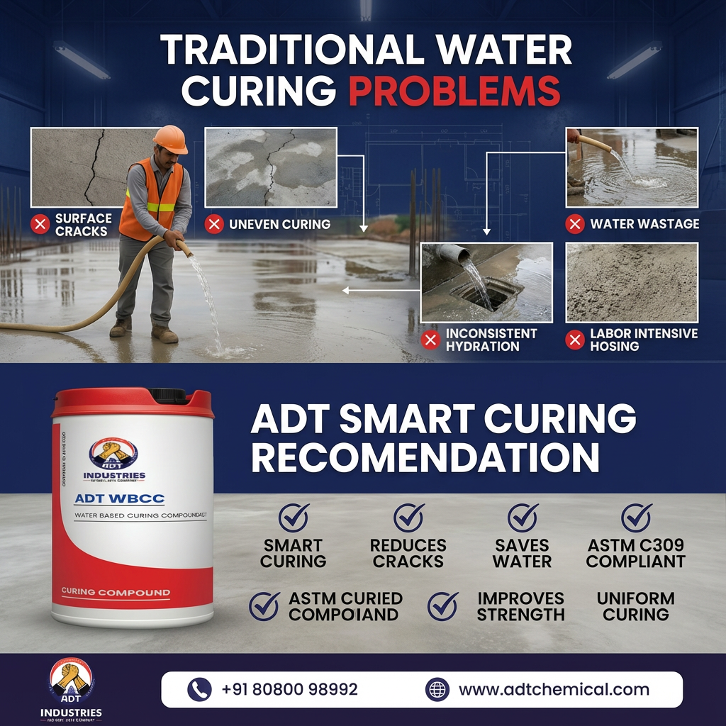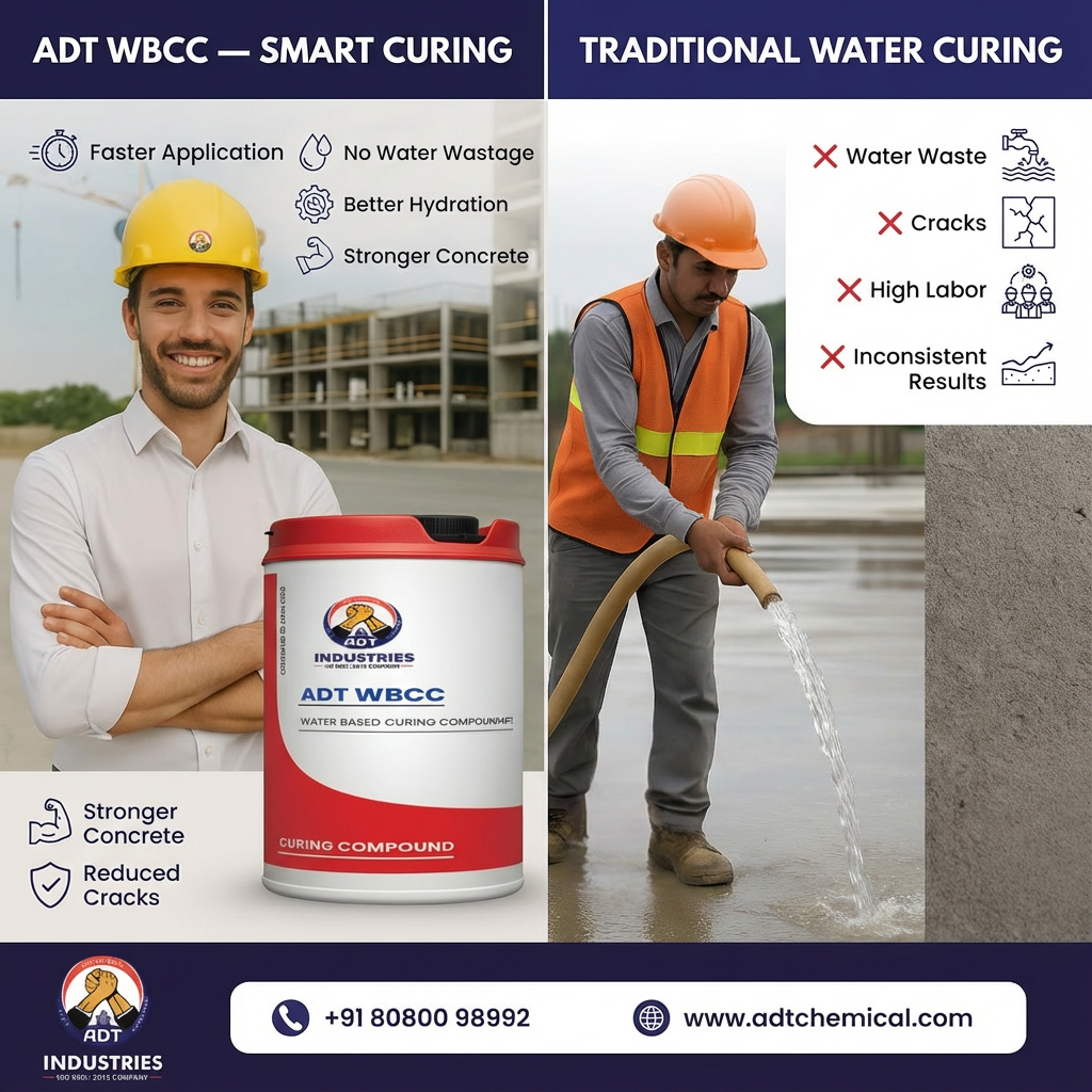ADT WBCC is a ready to use synthetic white pigmented concrete curing compound conforming to the specification of ASTM C 309 Type 2. ADT WBCC is especially useful for curing canals, pavement concrete, structural segments and precast elements. ADT WBCC induces high reflection effect and better reduction for curing concrete at tropical atmosphere